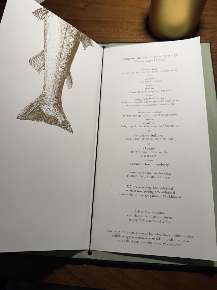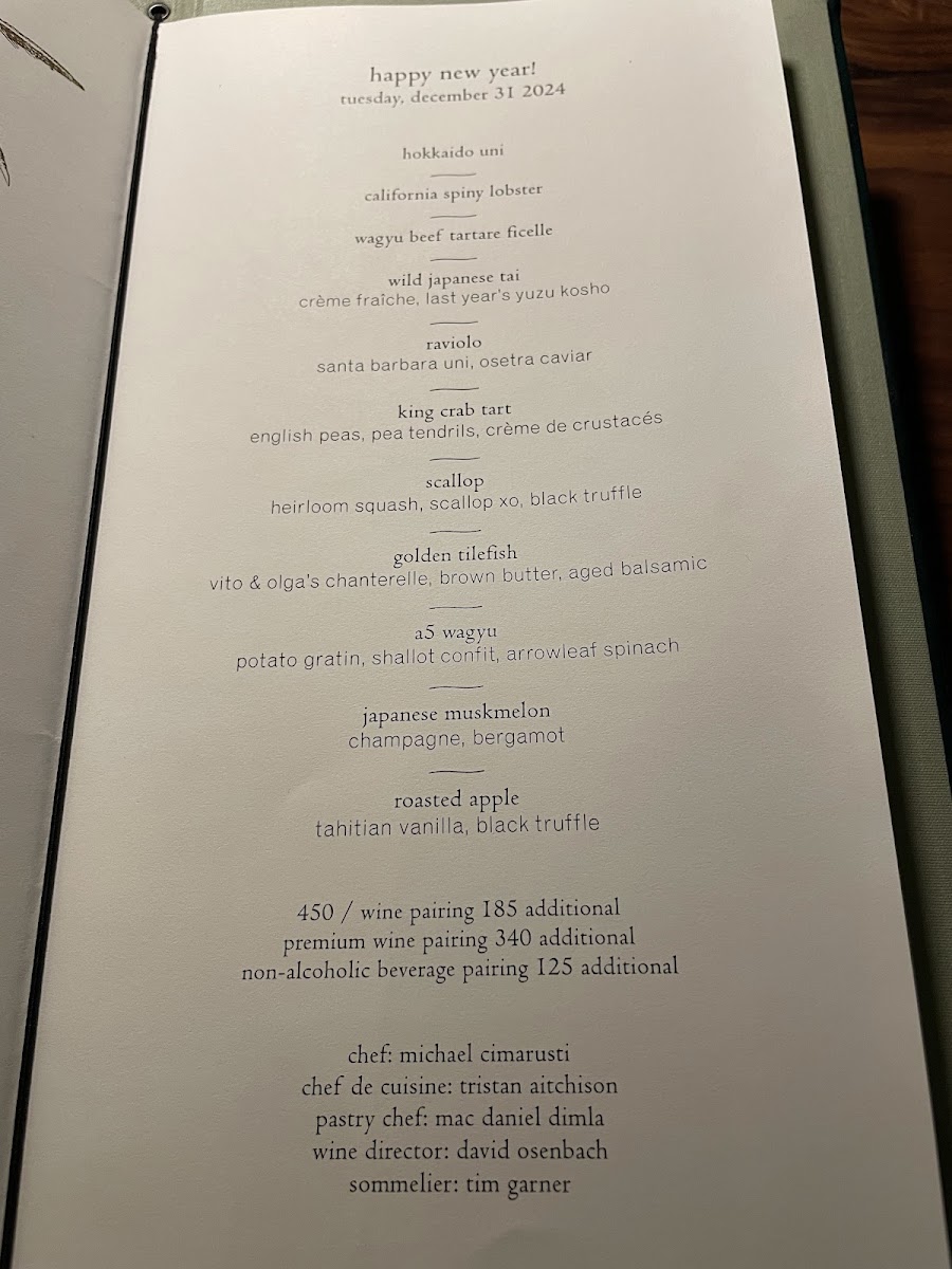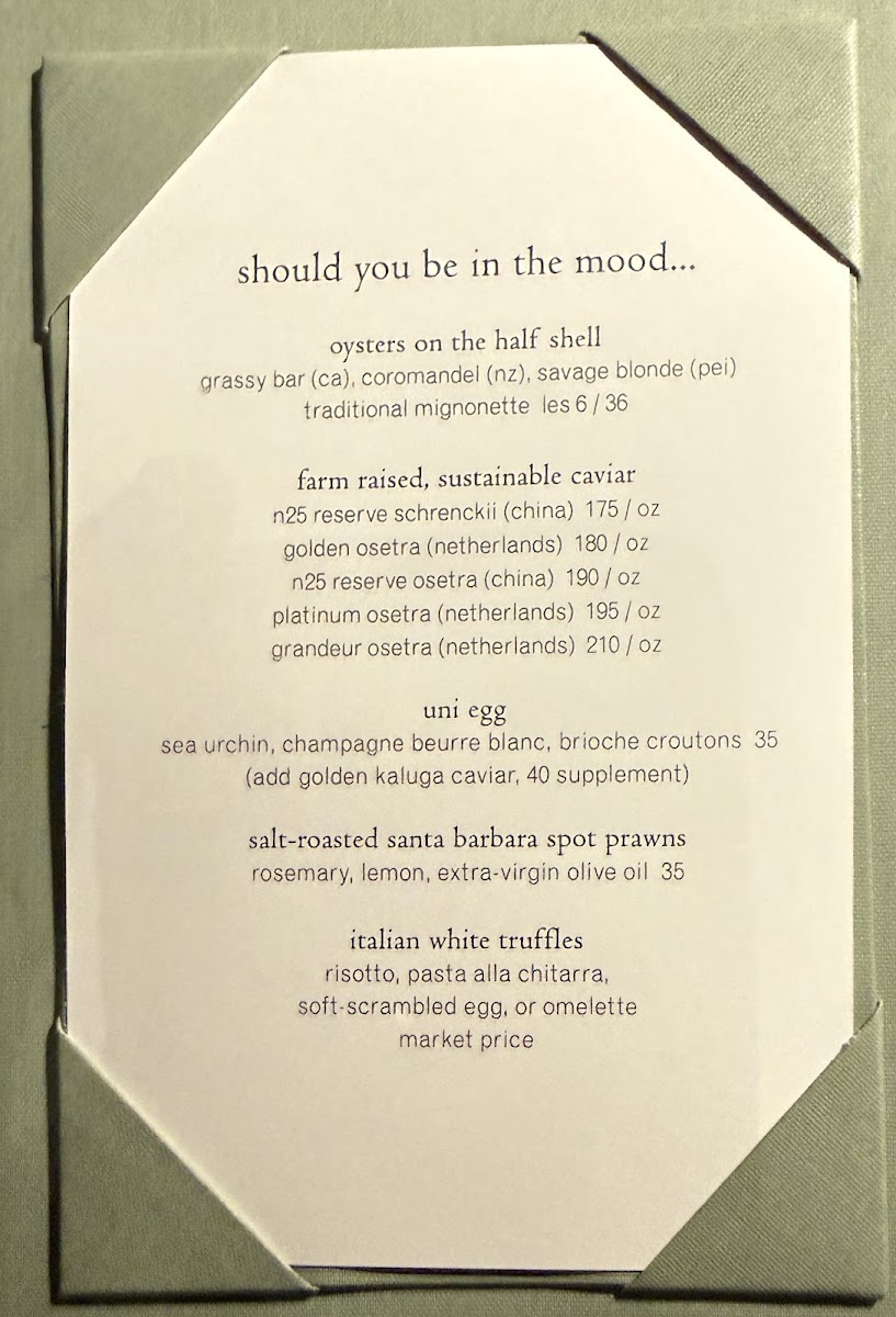The highlights continue with the salt-roasted Santa Barbara spot prawns, elevated by hints of rosemary and lemon, and the delightful uni egg, combining sea urchin with champagne beurre blanc for a taste unlike any other.